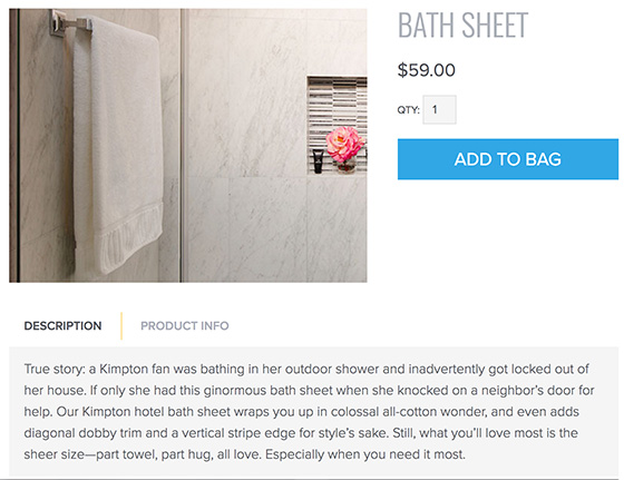 From zebra linens to menswear-inspired bathrobes, Kimpton Style sells the luxe products found in Kimpton hotels around the country. They really let me cut loose with the copy. Being tickled by a three-armed orangutan could not have been more fun.